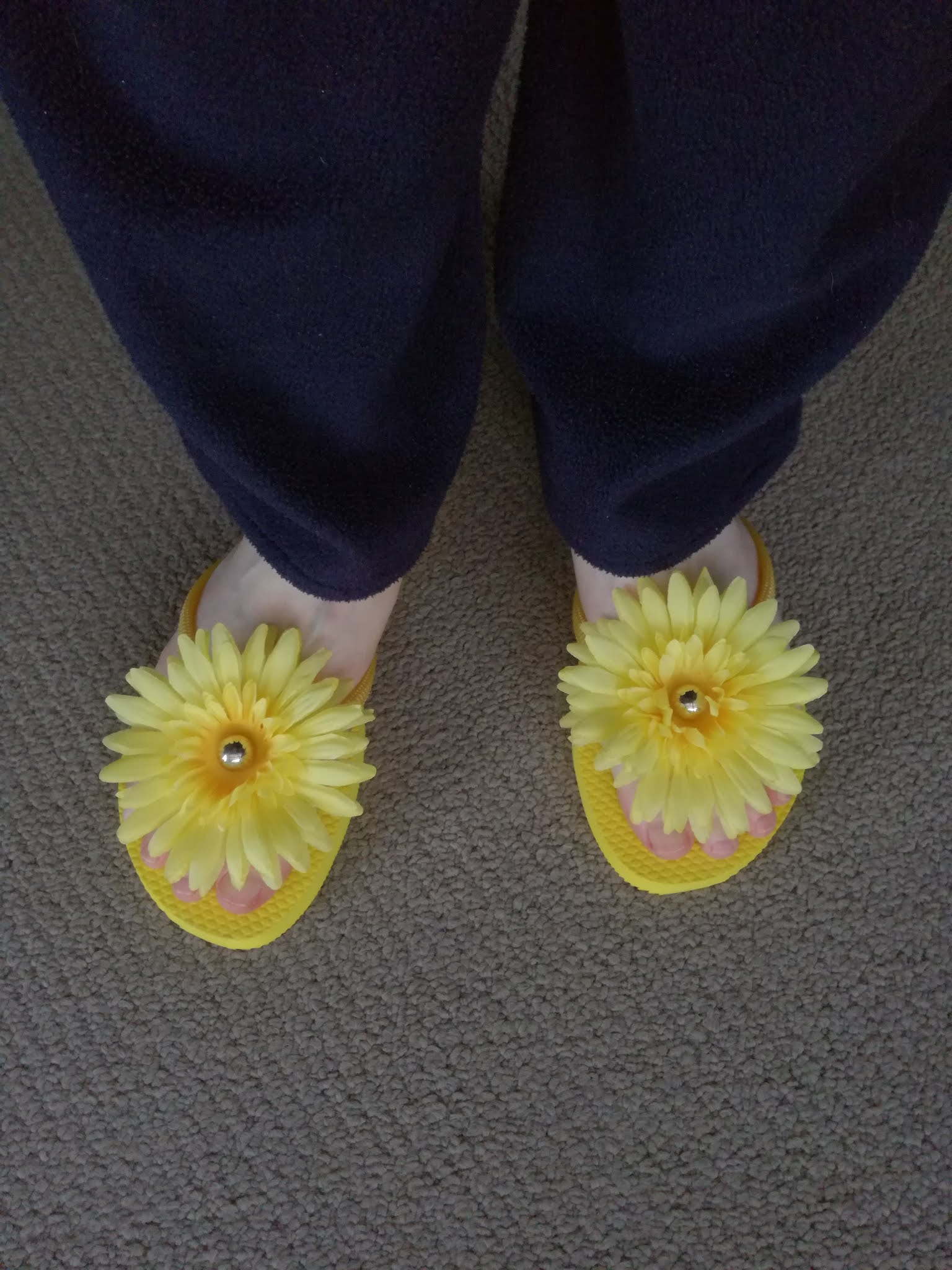 The winter primroses flowering when the jandals arrived gave inspiration for the summer gerberas... Creative note: I didn't find a glue that would adhere plastic to flexible rubber. I recommend tying the flower onto the thong with thread.